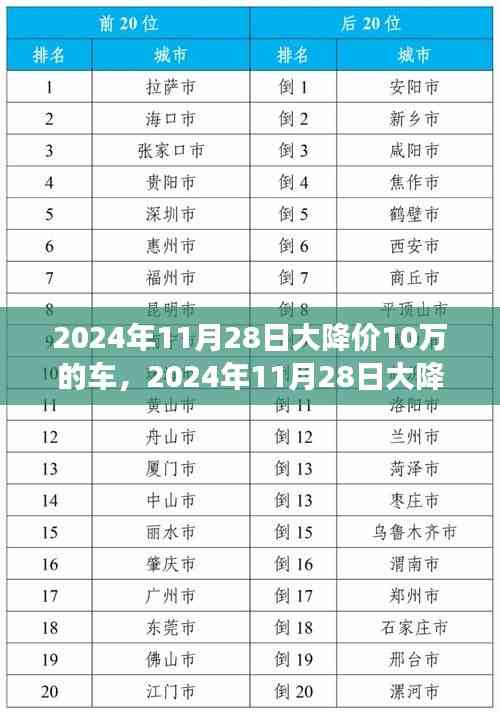 随着汽车市场的日益繁荣与竞争的加剧,各大汽车品牌纷纷推出各种优惠活动以吸引消费者目光,而即将到来的2024年11月28日,一场前所未有的购车盛宴即将上演,据悉,当天将有大量车型降价幅度高达十万,这是广大车友们不容错过的购车盛事,这一天的汽车大降价,究竟有哪些亮点值得我们期待呢?就让我们一起揭晓这场购车狂欢的奥秘。